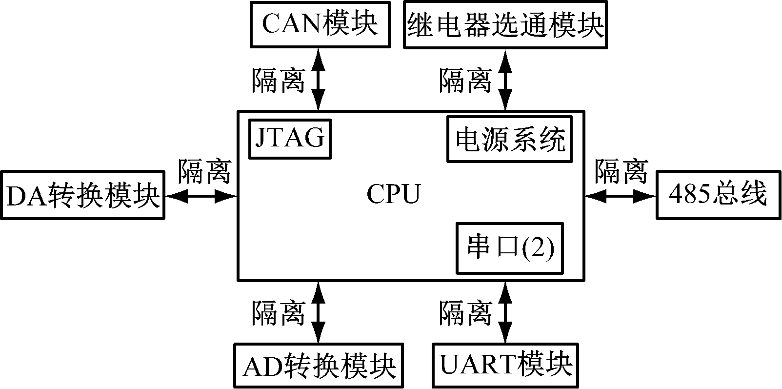 检测装置硬件电路主要功能模块分为CPU模块、CAN模块、UART模块、继电器选通模块、AD转换模块、DA转换模块、隔离模块等。
