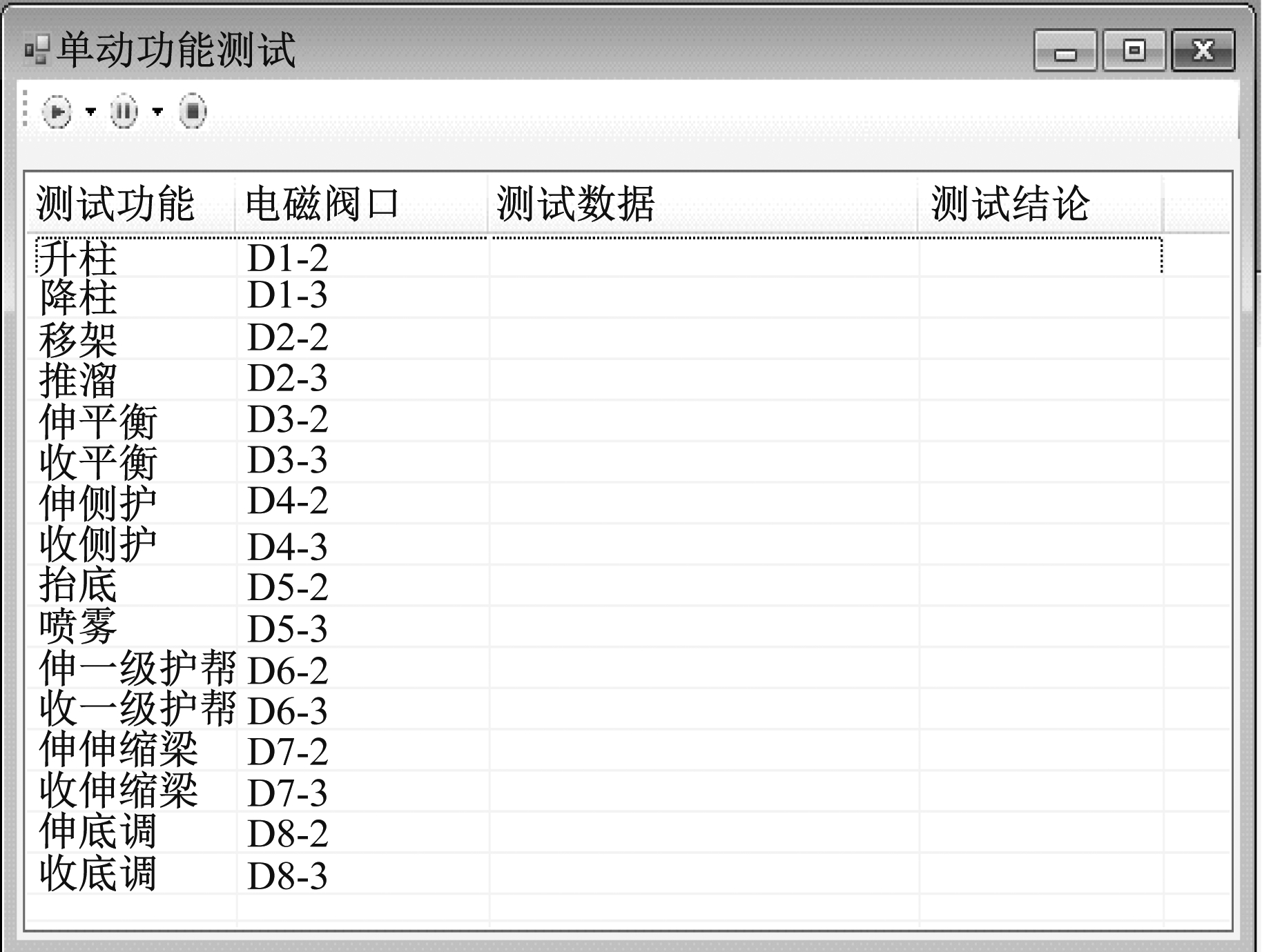 单动功能测试主要是验证控制系统所实现的液压支架立柱、推移千斤顶、护帮板、侧护板等构件控制是否齐全,对应功能的电磁阀输出口是否正确及电磁阀口输出功率是否满足电磁先导阀工作功率的要求,避免控制系统在现场调试过程中发生液压支架误动作,确保人员和设备的安全。