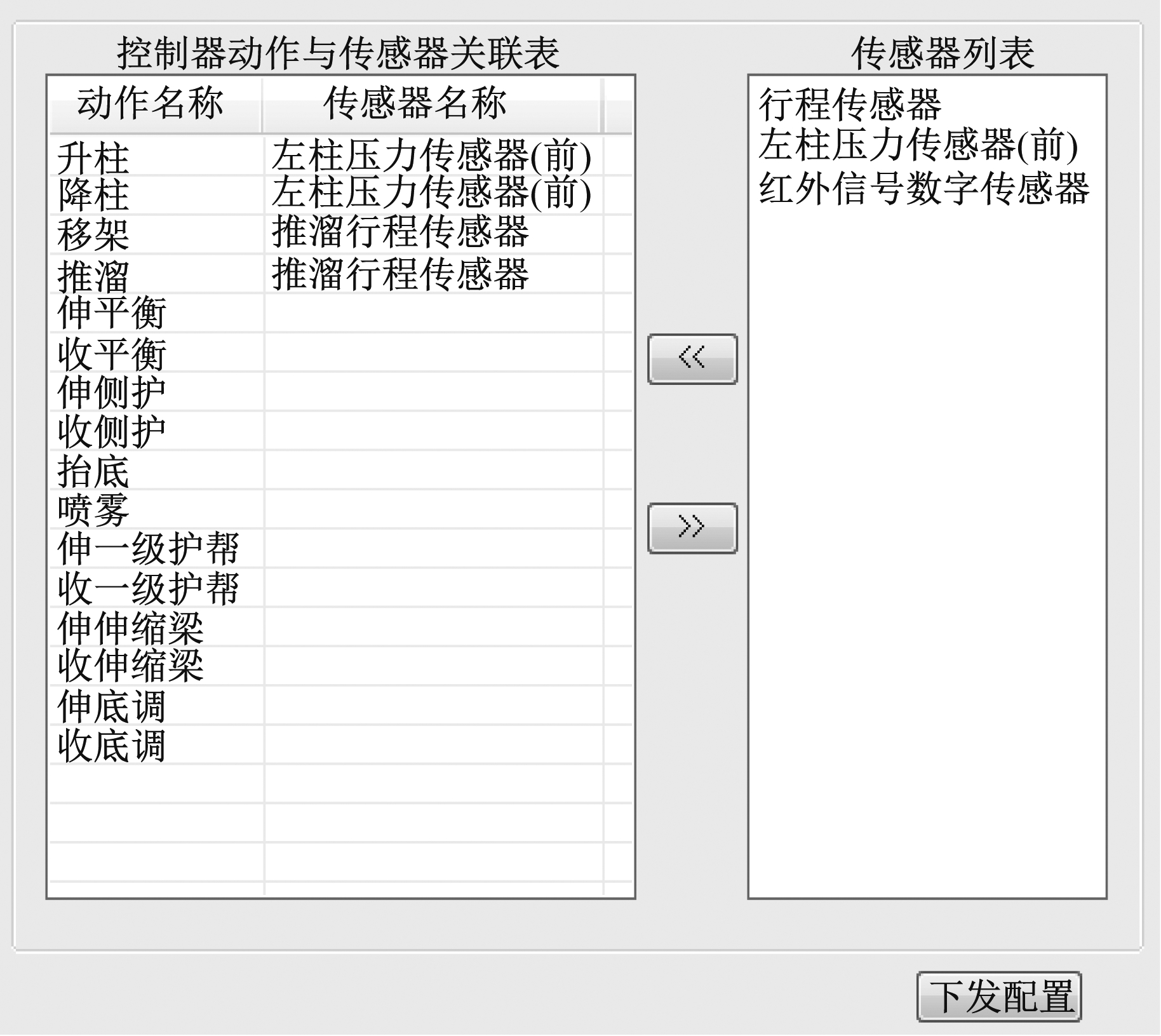 (4) 控制器动作与传感器关联定义:主要用于实现控制器动作过程中关联的传感器变化过程的同步模拟。根据该定义,检测装置在检测到控制器执行相关动作的过程中,自动执行与该动作关联的传感器模拟输出,使得控制器在控制液压支架动作过程中相关联的传感器数值同步发生变化。控制器动作和传感器关联定义如图8所示。