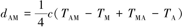 式中:dAM为定位分站到定位卡之间的测量距离;TAM为分站从发送测距信号到接收定位卡反馈信号的时间;TM为定位卡从接收到测距信号到反馈信号的延迟时间[8-10],即定位卡的数据处理时间,TM与定位卡处理器速度和时钟频率等因素相关,由于时钟频率精度不同,不同定位卡的TM值不同。