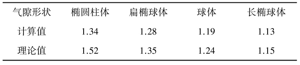 由图4、图5可知,由于空气的介电常数小于绝缘材料的介电常数,故4种不同形状的气隙中电场强度均大于无气隙缺陷时绝缘中电场强度。椭圆柱体、扁椭球体、球体、长椭球体气隙缺陷处的最大电场强度分别为2.82,2.68,2.48,2.37 kV/mm。而无气隙缺陷时,相同位置绝缘层中最大电场强度为2.09 kV/mm。气隙中与绝缘中电场强度比值的仿真计算值与理论值见表2。