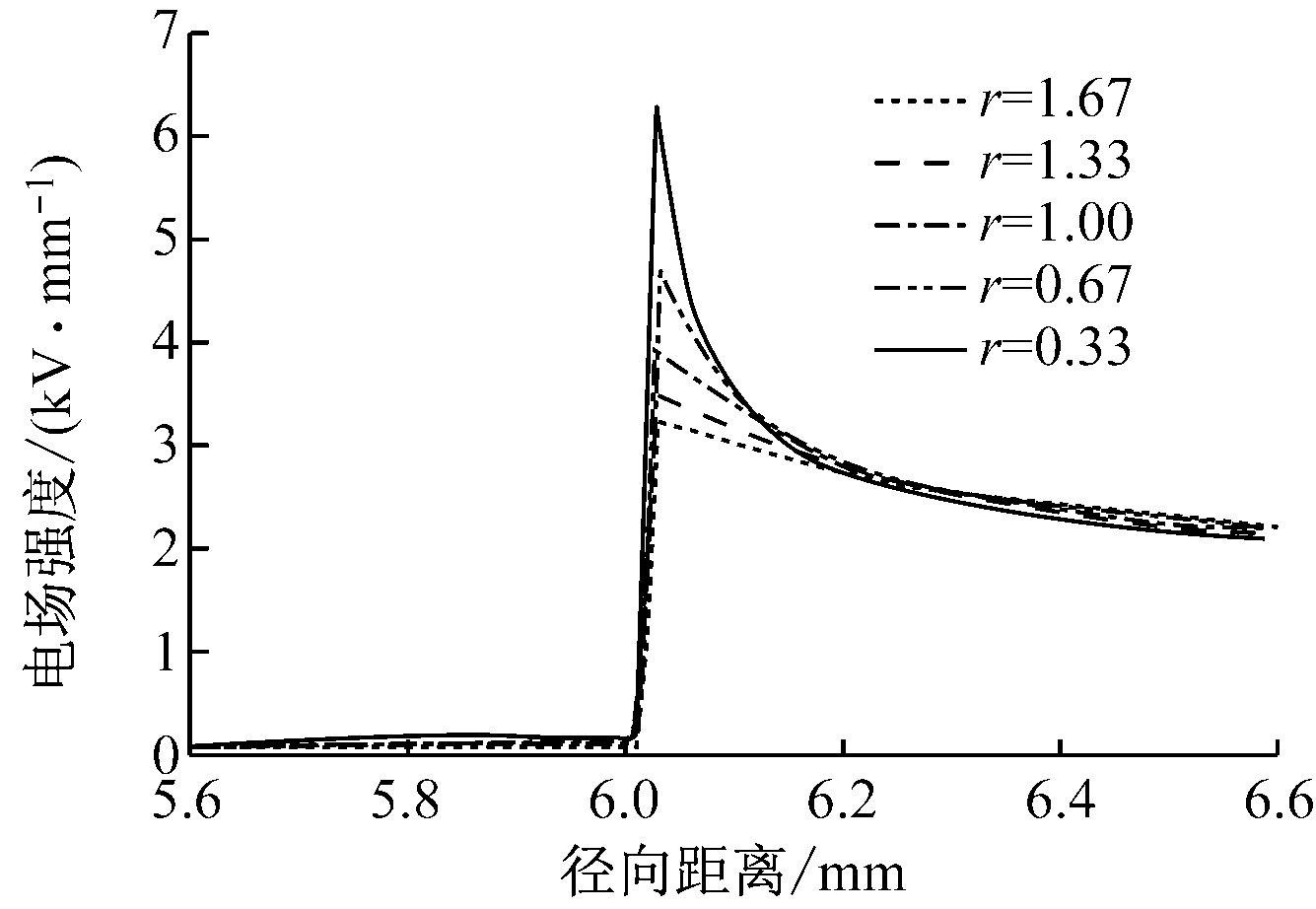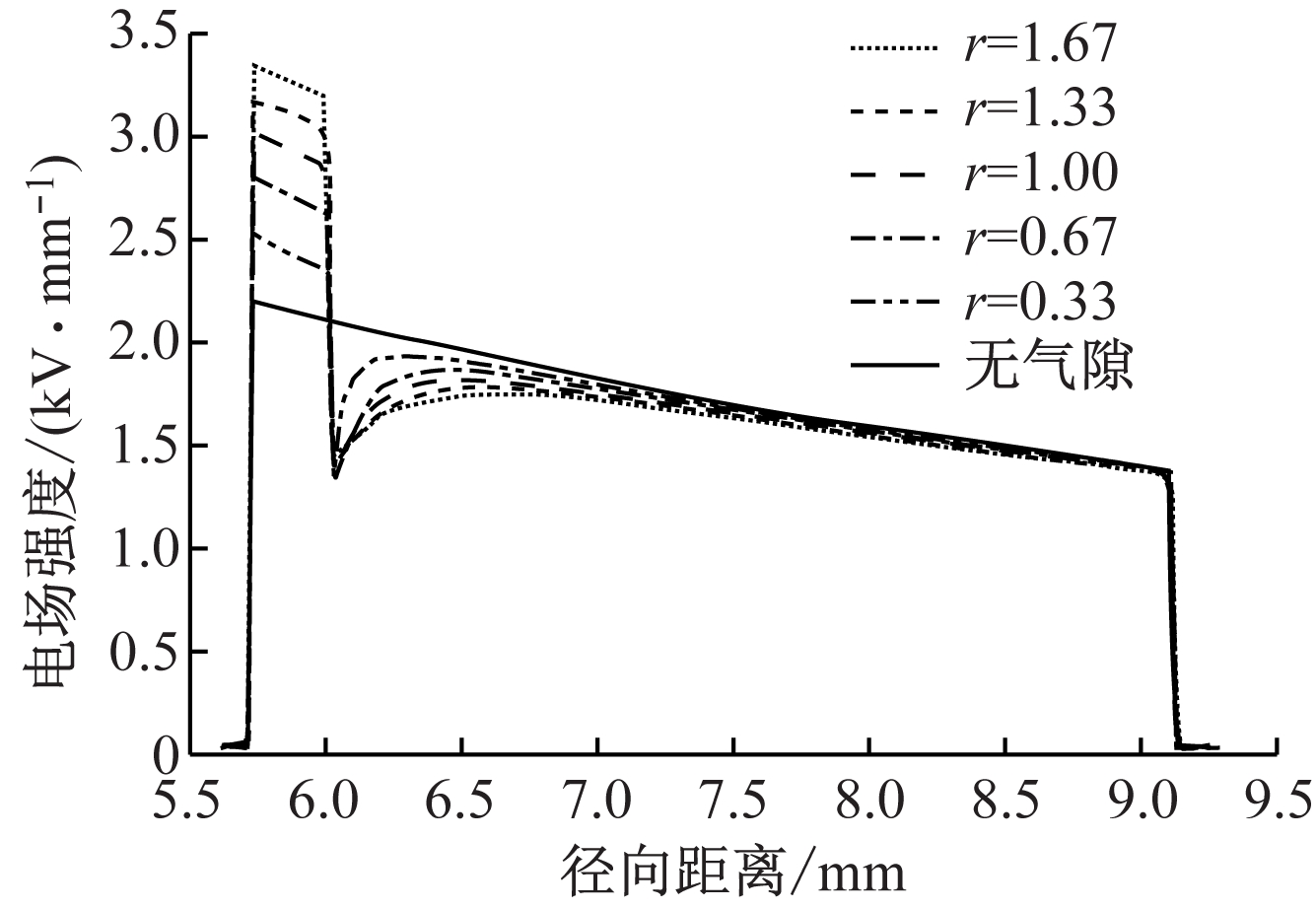 图8 包含不同r值气隙缺陷处的电缆径向电场分布曲线