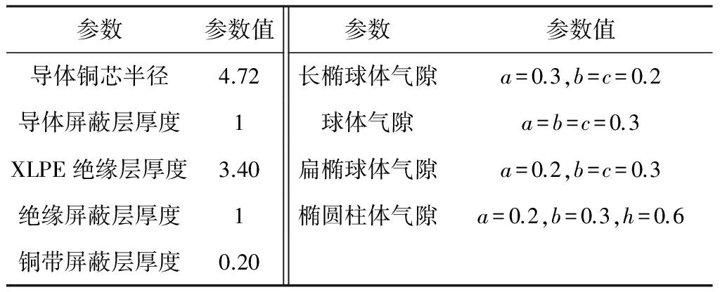 在对电缆结构进行电场分析时,模型维数的选择取决于结构的几何特征,即其轴对称特性在引入缺陷后是否被破坏。缺陷引入后电缆结构的轴对称性被破坏,则必须采用三维立体模型。本文结合矿井电缆实际应用情况,以10 kV MYJV22型矿用XLPE电缆为研究对象,按照1∶1的比例建立含不同形状气隙缺陷的电缆三维立体模型,如图3所示。模型具体几何尺寸及参数见表1。定义气隙中垂直于电场方向的长度为b,平行于电场方向的长度为a,且r=b/a。气隙形状分别为长椭球体(r<1)、球体(r=1)、扁椭球体(r>1)、椭圆柱体(r>1)。