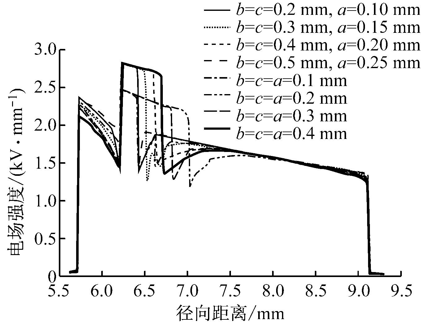 (4) 对于给定尺寸的气隙,随着绝缘层厚度的减小,气隙中电场强度与绝缘中电场强度均相应增大。这在高压电缆绝缘的优化减薄中是亟需关注的。