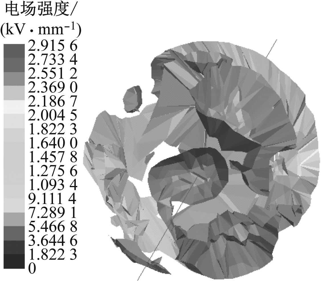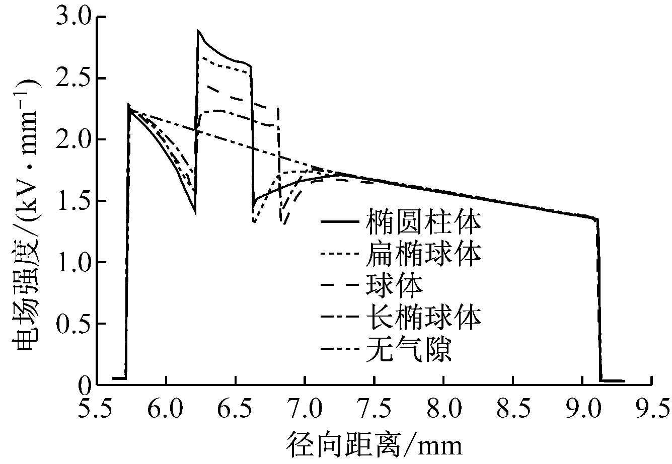如图3模型所示,4种不同形状的气隙均距离导体屏蔽层0.5 mm。球体气隙电场分布云图如图4所示,包含气隙的电缆径向电场分布曲线如图5所示。