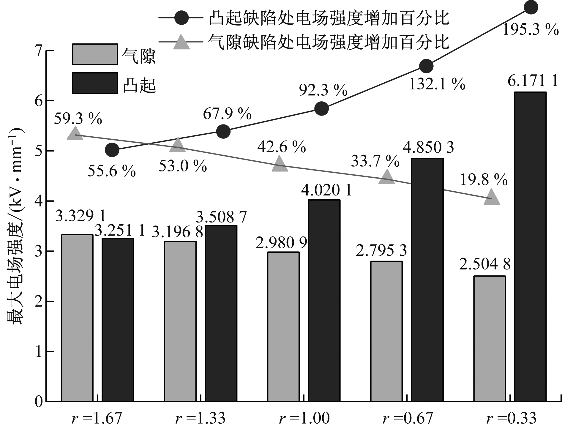 由图10可知,在r值较小时,凸起缺陷处电场强度明显大于气隙缺陷处电场强度;随着r值的增大,气隙缺陷处电场强度超过凸起缺陷处电场强度。气隙缺陷处电场强度增加百分比随r值的减小而缓慢减小,凸起缺陷处电场强度增加百分比随r值的减小则急剧增大。