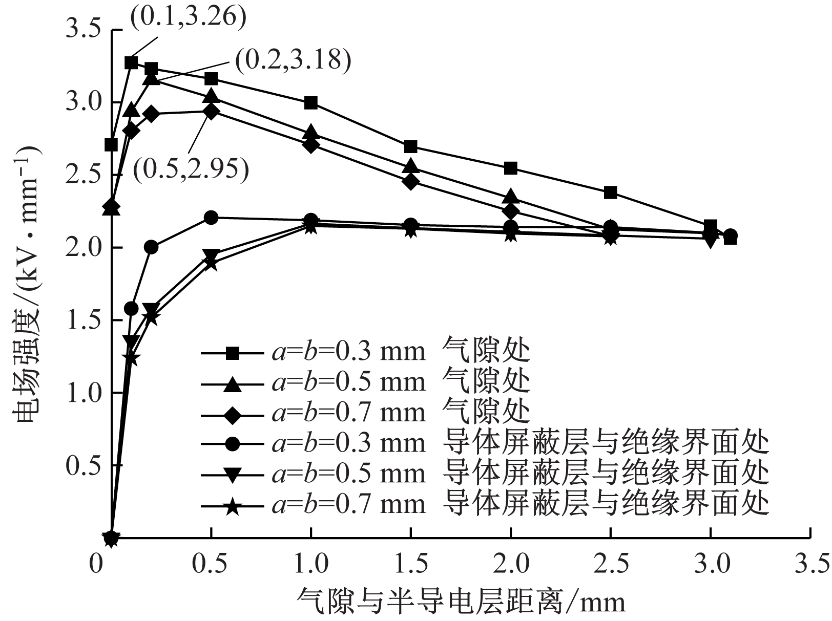 分析绝缘中气隙位置对电场分布的影响时,以图3模型中球形气隙为研究对象,气隙半径分别设为0.3,0.5,0.7 mm。研究气隙处电场及导体屏蔽层与绝缘层界面处电场与气隙位置的关系,如图11所示。由图11可知,对于半径不同的气隙,随着气隙距离导体屏蔽层距离的增大,气隙处最大电场强度均先增大后减小。且随着气隙半径的增大,气隙处最大电场强度依次出现在距离导体屏蔽层0.1,0.2,0.5 mm处。而导体屏蔽层与绝缘层界面处电场强度则一直增大,且在2.25 kV/mm附近基本保持不变。气隙靠近导体屏蔽层时,导体屏蔽层与绝缘层界面处电场强度接近于零,且气隙中电场强度稍有减小。分析其原因:导体屏蔽层半导电材料的电阻率远小于绝缘材料的电阻率,正常情况下导体及半导电层的电位相同。即使导体与屏蔽层之间存在气隙缺陷,在气隙上也不会存在压降,因此,导体屏蔽层与绝缘层界面处电场强度接近于零。