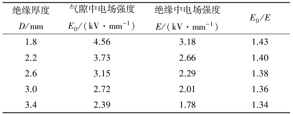 表3 不同绝缘厚度下气隙中电场强度与绝缘中电场强度的比值
