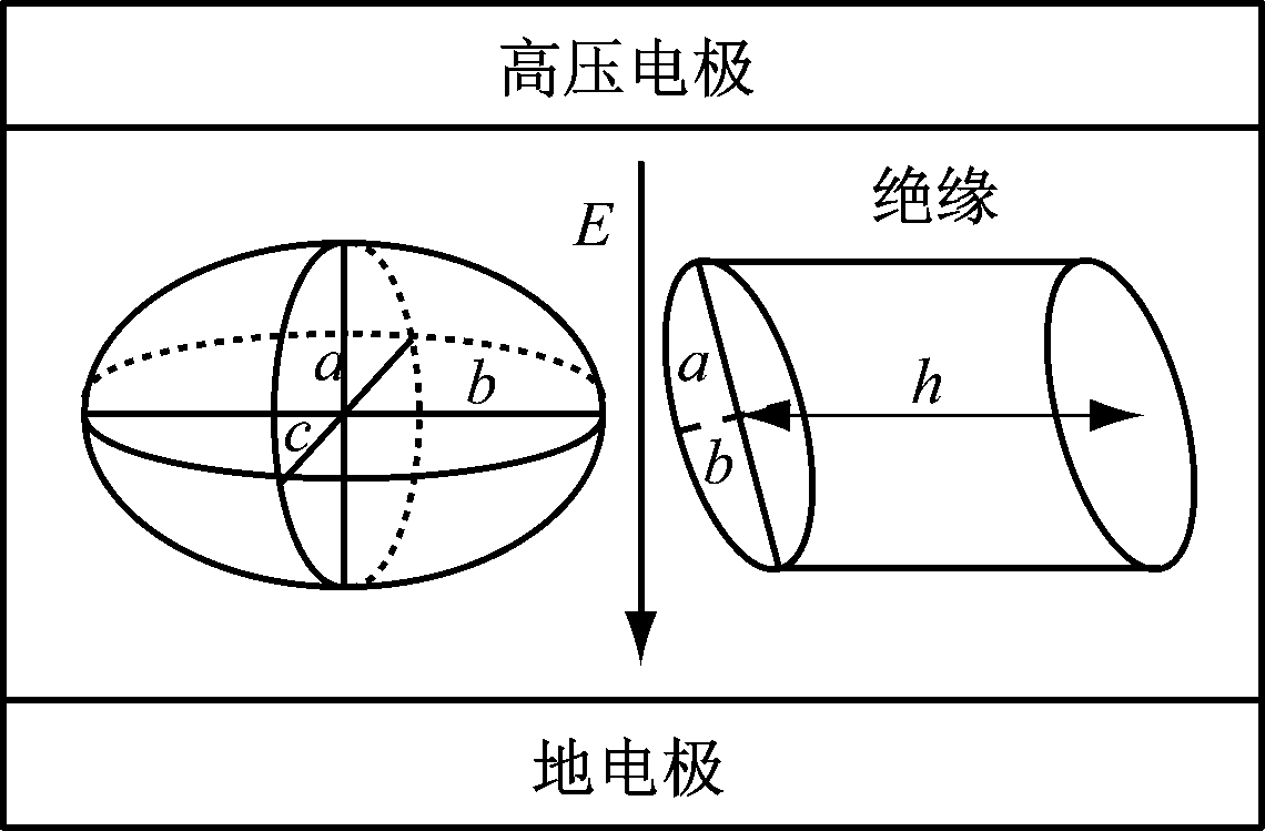 椭球体气隙中的电场强度Ee计算公式如式(2)所示。本文中仅讨论b=c的椭球体(c轴亦垂直于电场方向,其影响等同于椭圆柱的b轴),且取截面为ab或ac平面。理论分析所采取的气隙模型如图1所示(h为椭圆柱体高度)。