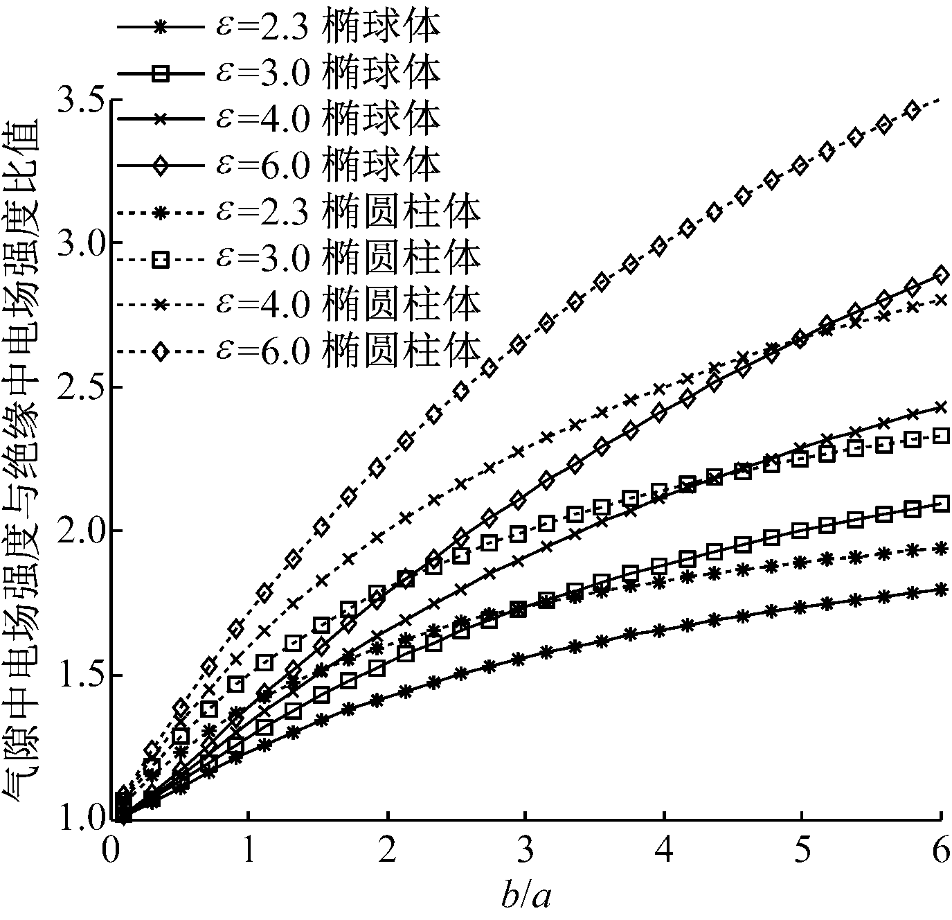 不同形状气隙中电场强度与气隙尺寸的关系曲线如图2所示。图2中仅考虑了气隙形状及尺寸的影响,并未考虑线芯电压、气隙位置等因素的影响。由图2分析可得,在绝缘介电常数相同时,椭圆柱体气隙中电场强度与绝缘中电场强度比值始终大于椭球体气隙中电场强度与绝缘中电场强度比值,即椭圆柱体气隙的电场强度始终大于椭球体气隙电场强度。对于椭球体气隙,当b=a时,气隙为球体,气隙中电场强度约为绝缘中电场强度的1.22倍;当b>a时,气隙为扁椭球体;当b<a时,气隙为长椭球体。3种气隙中电场强度大小关系如下:扁椭球体>球体>长椭球体,即垂直于绝缘中电场E方向的b轴长度越大,气隙中电场强度也越大。对于椭圆柱体气隙,当b=a时,气隙对应为三维中的圆柱体状,气隙中电场强度约为绝缘中电场强度的1.41倍。气隙形状与尺寸相同时,其内部电场强度随着绝缘介电常数的增大而增大。