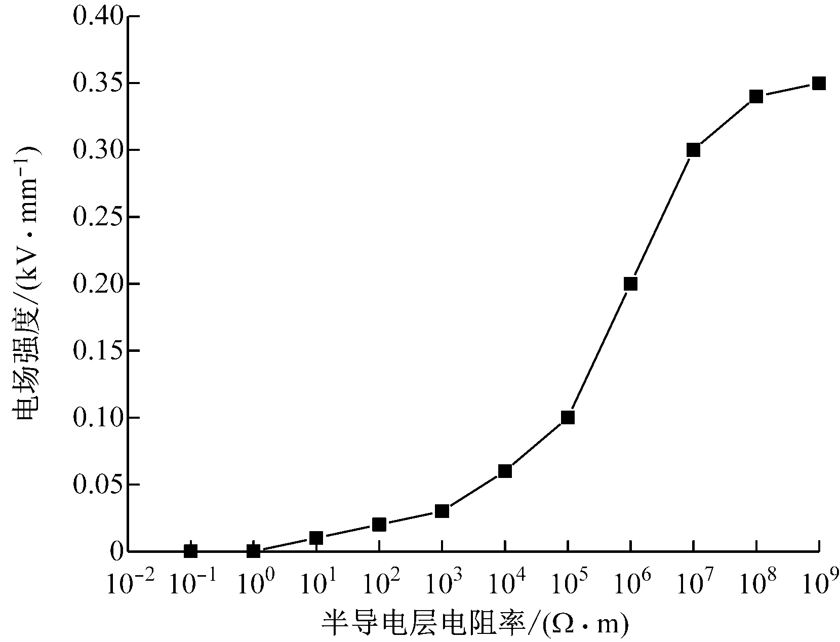 由图12可知,对于半径为0.3 mm的球形气隙,在半导电层电阻率小于103Ω·m时,气隙电场强度几乎为零;但当半导电层的电阻率高于106Ω·m时,气隙电场强度显著提升。随着电压等级的提高,微小气隙电场可能会超过空气的击穿电场强度,导致故障。半导电层的热效应要求半导电层电阻率ρ≤102Ω·m是合适的[13-15]。