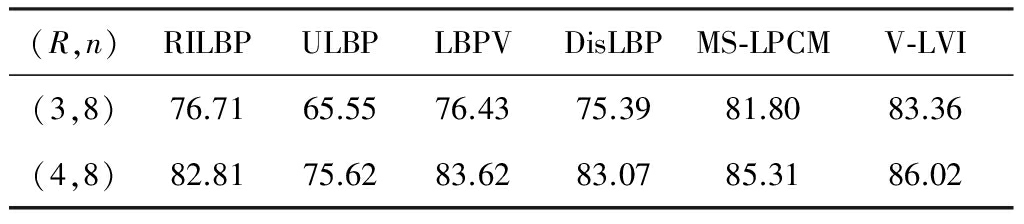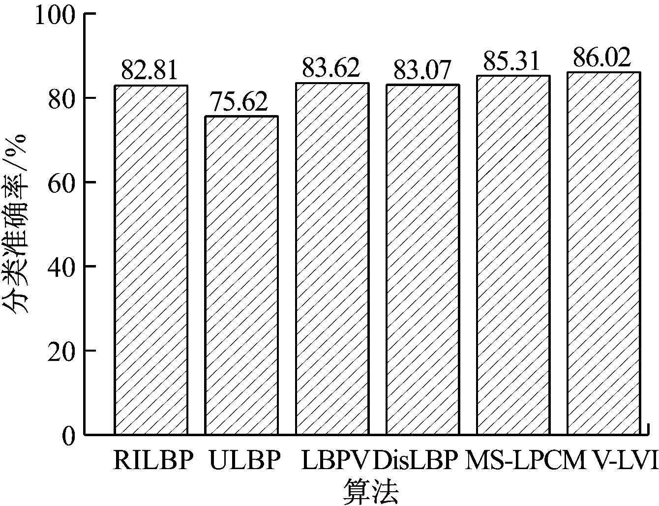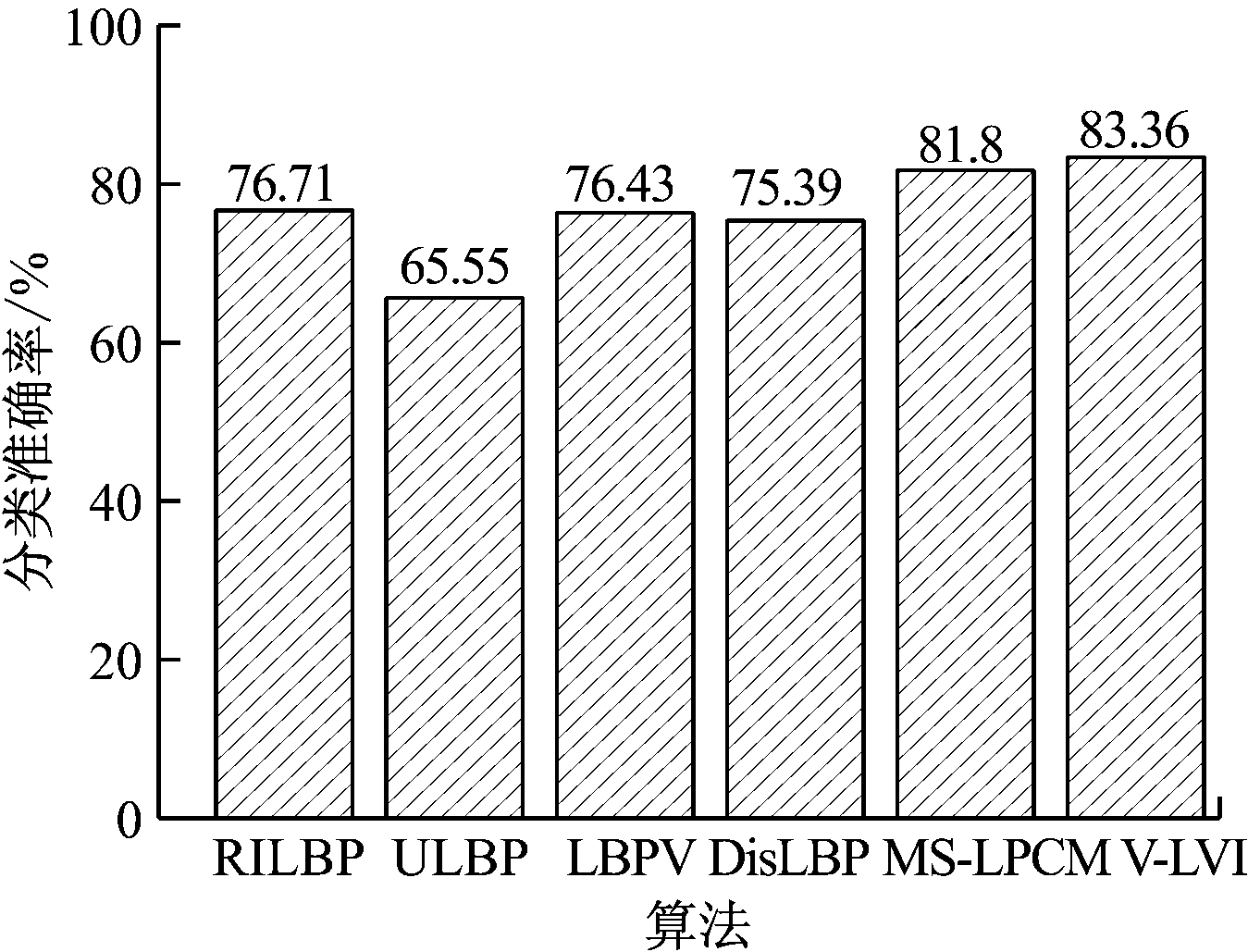 从分类结果可以看出,V-LVI算法的分类准确率最高,达到了86.02%,这是因为V-LVI算法对LBP特征信息和局部方差图中的方差分布信息进行了融合。在其他算法中,MS-LPCM算法比较充分地利用了局部信息和模式分布信息,其分类准确率也较高,但是MS-LPCM算法对距离近似为R的模式对也进行了统计,因此,所提取的特征不够准确;ULBP算法的分类准确率要低于RILBP算法,说明在该数据集中非统一模式同样包含了对分类有用的信息;LBPV算法将反映局部纹理信息的方差融入到LBP统计中,所以,其分类准确率较传统LBP算法有所提高;虽然DisLBP算法中融合了费舍尔判别思想,但其对类别信息的利用只是停留在局部模式数量的层次,这种对类别信息的利用方式并不理想,有时甚至会丢失关键信息,因此,相对于其他算法其分类准确率并不高。