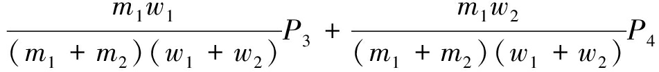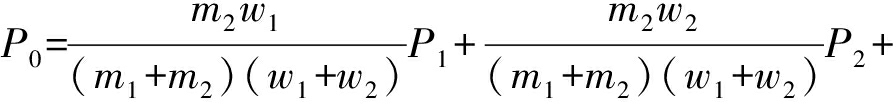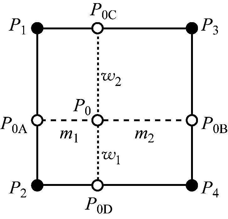 当选择的方向不是轴向时,首先以子图像中心像素为参考,确定该方向对应亚像素及其邻域点位置,然后通过双线性插值计算邻域点的灰度值,进而求得对应亚像素的局部方差,最后在该方向上的亚像素局部方差集合中计算变差函数。设P1,P2,P3,P4为空间中呈正方形角点关系分布的4个相邻像素,P0为正方形区域内或边界上的任一亚像素。P0与正方形边界的距离分别为m1,m2,w1,w2,其在边界上的对应点分别为P0A,P0B,P0C,P0D,如图4所示。