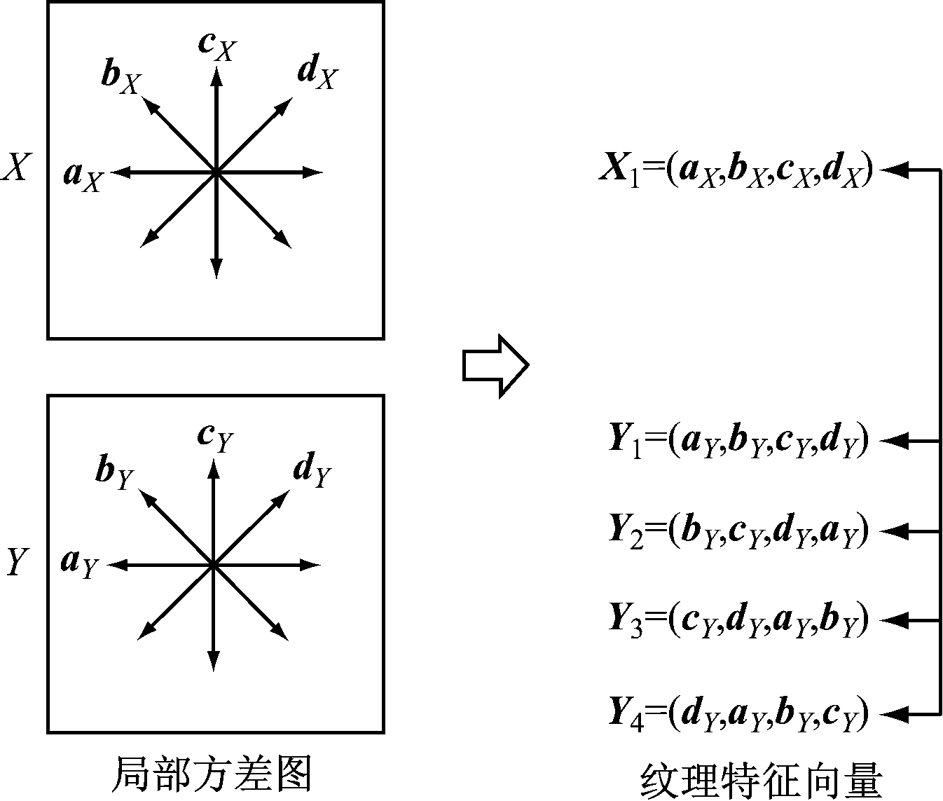 在2.2节中,将变差函数矩阵中的变差函数向量顺序连接得到纹理特征,但该纹理特征并不具有旋转不变性,特别是对于各方向变化不均匀的纹理。将变差函数向量依次顺序连接并分别计算相似度可以很好地解决这一问题,为了更清晰地描述,以图6为例进行说明。对于训练样本X和测试样本Y,分别计算出它们4个方向的变差函数向量aX,bX,cX,dX和aY,bY,cY,dY,各向量的方向关系如图6所示,对于训练样本X,从aX开始顺序连接各变差函数向量得到特征向量X1,对于测试样本Y,分别从aY,bY,cY,dY开始顺序连接各变差函数向量得到4个特征向量Y1,Y2,Y3,Y4,这4个特征向量组成旋转特征向量组。分别计算旋转特征向量组中各向量与X1的相似度,并取最小值作为样本Y与X的相似度,即