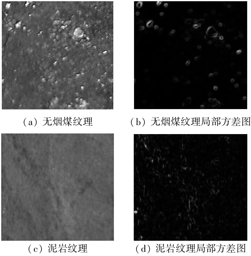 在局部方差图中,像素值越大,说明在以该像素为中心的局部区域中像素之间的灰度值对比越明显,通常来说,边界的局部方差会很大,而灰度变化较为平缓的区域局部方差很小,局部方差的空间分布反映了纹理的空间分布,这也是V-LVI算法提取纹理特征的理论基础。从图2可看出,煤、岩的局部方差图纹理结构有较大的不同。