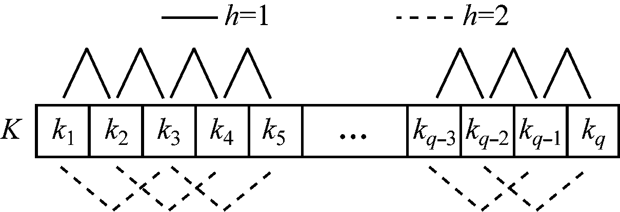 变差函数又称为半方差图[15]。变差函数是一个以步长为自变量的函数,在灰度图像某一方向上,一定步长下的像素对灰度之差组成一个集合,这个集合中元素值方差的一半就是该步长下的变差函数值,通过改变步长可以得到多个与步长对应的函数值,通过近似连续的步长计算可以得到变差函数曲线,变差函数的计算如图3所示,图中分别用实线和虚线标示出了步长h为1和2时的像素对组合。