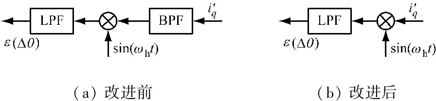 与sin(ωht)相乘再经LPF处理,即使省去带通滤波器(Band Pass Filter,BPF)环节,仍可滤去无关电流,并可获得ε(Δθ)。改进后脉动高频电压注入法的滤波环节如图2(b)所示。