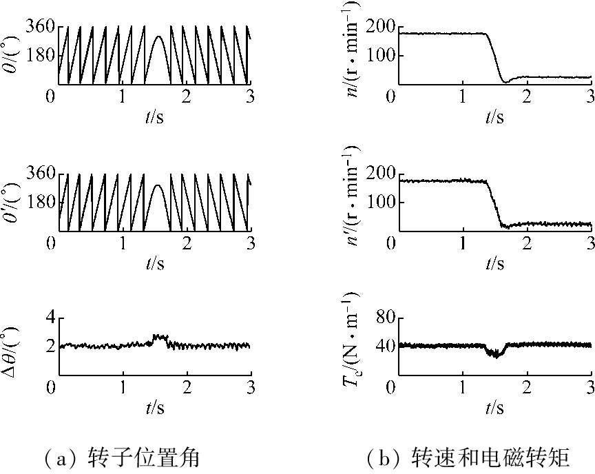 IPMSM以80 r/min低速运行,在1.5 s时电动机反转的仿真结果如图6所示,可看出在反转时刻Δθ增大,n和n′基本一致,Te减小,在0.3 s后均恢复稳定。