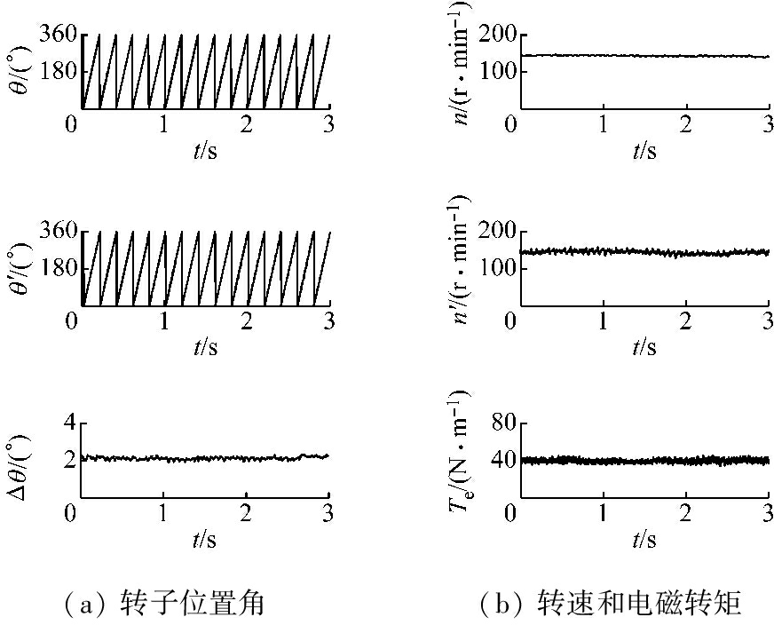 IPMSM以150 r/min转速正常工作的仿真结果如图5所示(n,n′,Te分别为实际转速、估算的转速和电磁转矩),可看出θ和θ′基本一致,误差在2°左右,并能较好地跟踪转速,Te保持稳定。