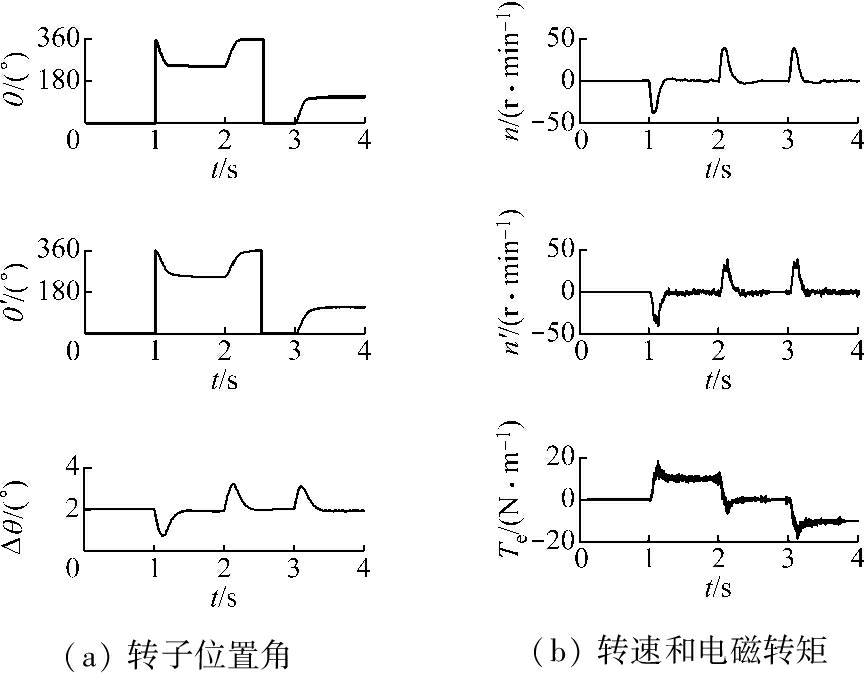 IPMSM以零速运行,在1 s时带10 N·m电动性负载,2 s时卸去负载,3 s时带10 N·m发电性质负载的仿真结果如图7所示,可看出突加、突卸负载导致Δθ增大,n和n′基本一致,突加负载导致Te增大,突减负载导致Te减小,但约0.3 s后均恢复稳定。