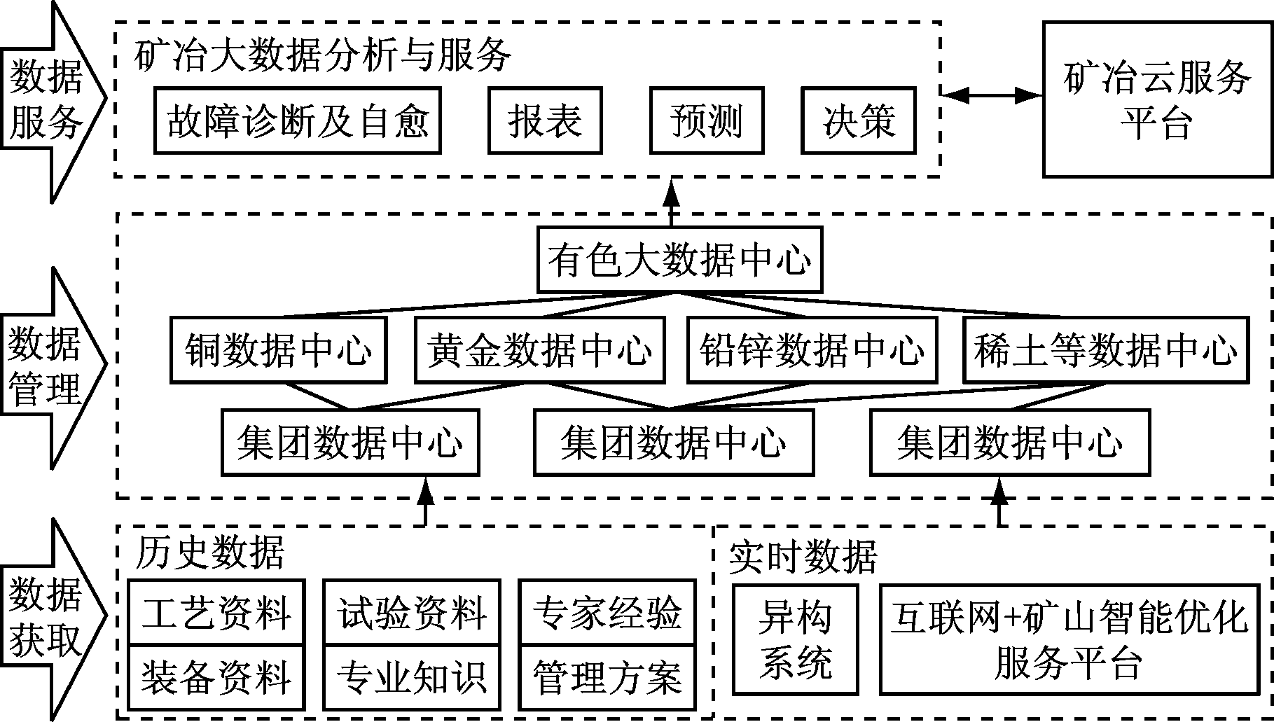 (2) 生产作业及数据应用环节。主要包括数据获取、数据管理和数据服务3个层级。数据获取层将获取的历史数据和实时数据传输至数据管理层数据中心,数据管理层对不同种类的数据进行存储管理,数据服务层对数据中心的数据进行分析、挖掘和应用,最终实现矿冶大数据的分析和服务,为预测和决策提供技术手段。生产作业及数据应用环节如图5所示。