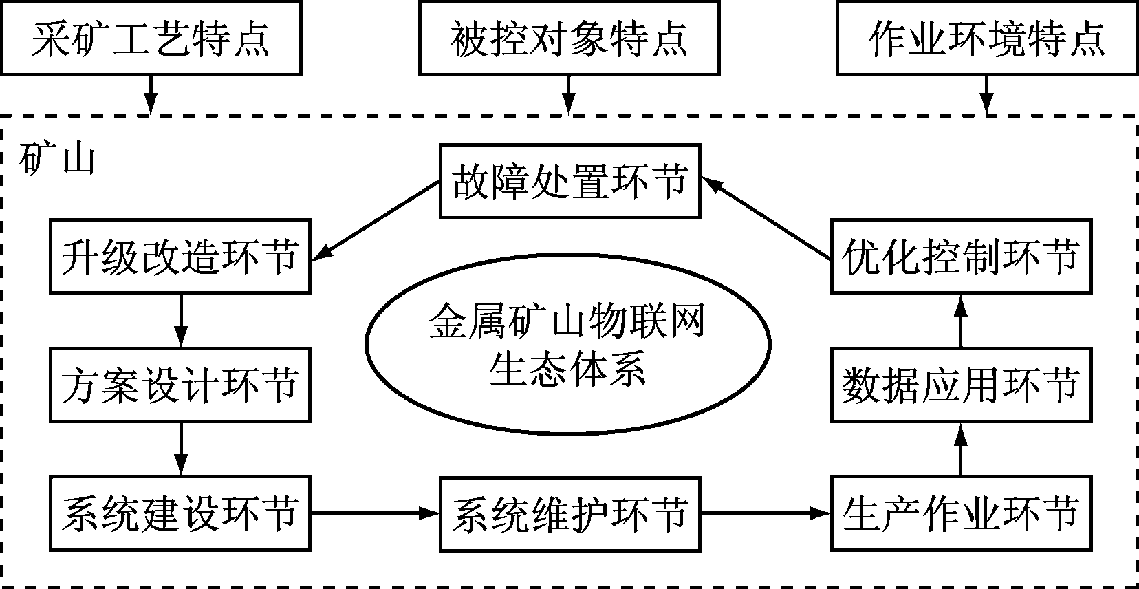 金属矿山物联网生态体系建设过程中需重点考虑矿山的采矿工艺特点、被控对象特点和作业环境特点,重点把控方案设计、系统建设、生产作业、数据应用、系统维护、优化控制、故障处置、升级改造等环节,如图4所示。通过方案设计及系统建设保障系统的有效性和可靠性,通过系统维护保障其工作在最佳状态,通过生产作业和数据应用提高智能化技术的投用率,通过优化控制、故障处置和升级改造使系统长期稳定、可靠运行。各环节密不可分,是一个有机的整体。