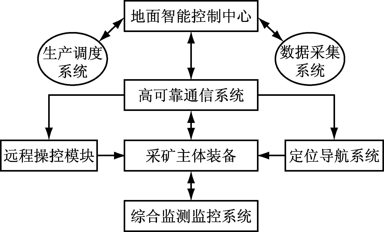 金属矿山物联网生态体系架构如图2所示。采矿主体装备通过矿山综合监测监控系统获取工作区域的环境状态、系统运行状态和作业目标状态,通过远程操控模块进行本地控制、视距控制、远程控制甚至全自动控制,通过定位导航系统实时反馈自身位置信息,通过高可靠通信系统实现与地面智能控制中心之间的数据传输。整个金属矿山物联网生态体系与矿山生产调度系统连接,实现生产作业过程优化管控和智能决策,并通过数据采集系统获取实时数据,支持智能化分析和决策。
