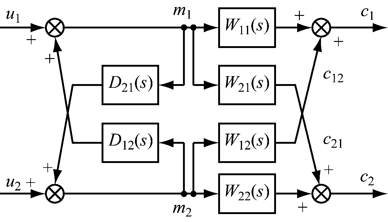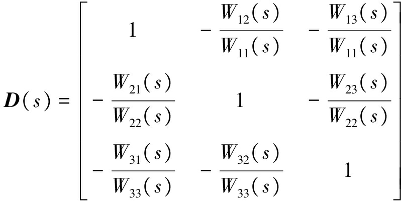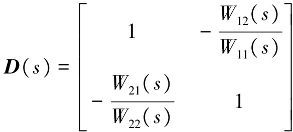 由图1可知,当系统为双输入、双输出系统时,第1通道的输入部分会与第2通道的主通道部分产生耦合作用,影响系统输出。同时,第2通道的输入部分也会与第1通道的主通道部分产生耦合作用,影响系统输出。因此,需要设置解耦环节,以减小耦合产生的影响。