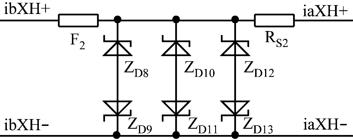 由于信号能量相对较小,所以,限能电路中采用具有线性输出特性的保护电路,具体电路如图3所示,由保险丝F2与稳压二极管ZD8—ZD13组成三级限压电路,由电阻RS2对输出电流进行限制,电路满足“ia”等级安全设计要求。信号转换电路保护原理:一旦本安输出端出现过压,限压稳压管将迅速导通,其最高电压将限制在VZ+0.8 V,VZ为限压稳压管击穿电压;若本安输出端发生短路,由于RS2的限流作用,输出的最大电流为(VZ+0.8 V)/RS2。