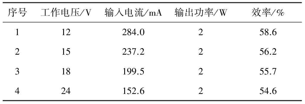 不同输入电压下的电源转换测试结果见表1。从表1可知,在12~24 V的输入电压范围内,“ia”安全防爆等级输出电源的最高转换效率为58.6%。
