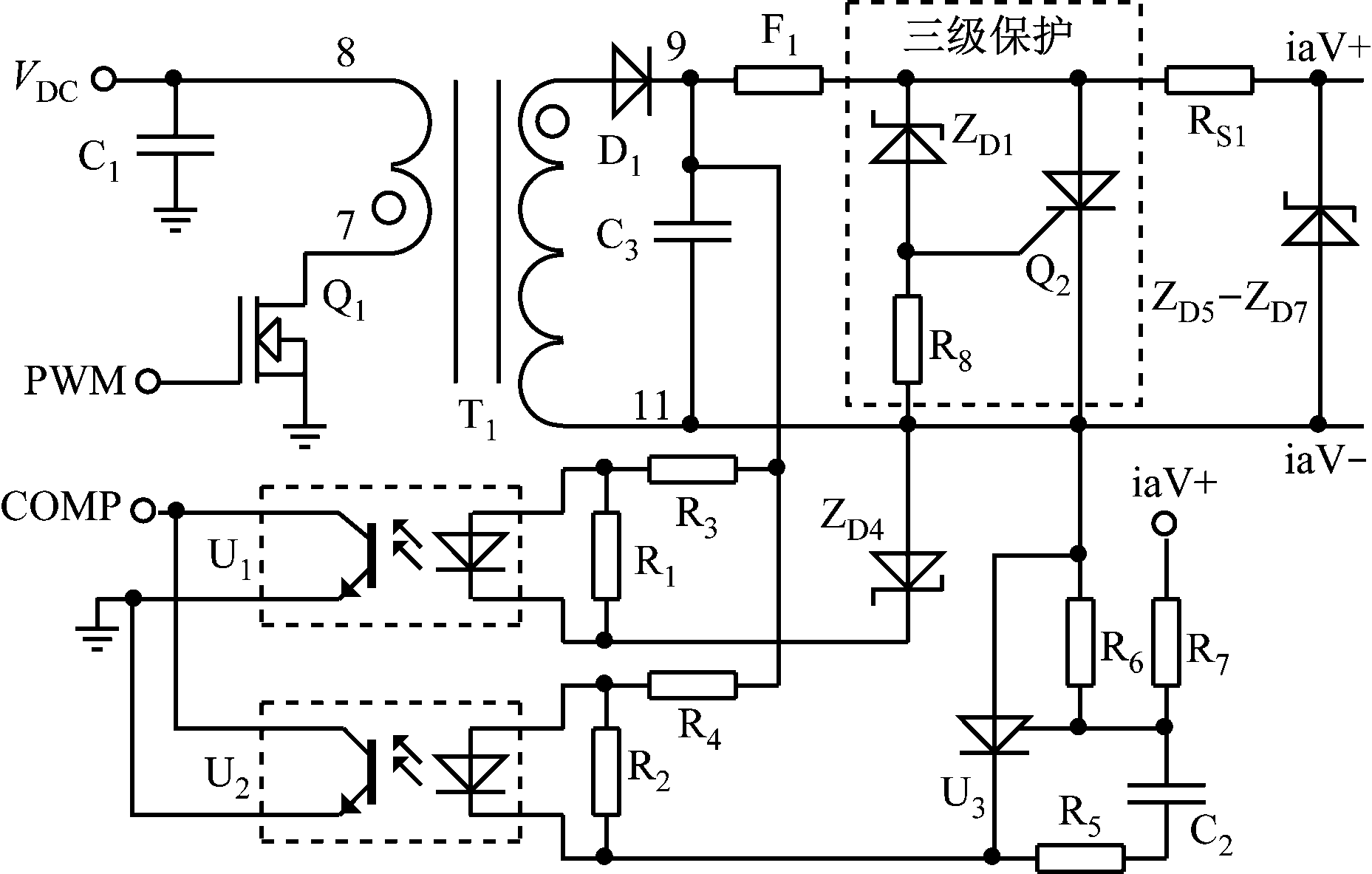 反激及限能电路采用两级电压反馈的反激拓扑与输出前后两级限压的方式,如图2所示。限流电路采用阻性电阻限流,因此,电路设计满足“ia”安全防爆等级设计要求。其工作原理:当输出电源所带负载的电流值小于0.2 A时,输出额定电压值PWM调制的占空比主要由稳压比较器U3、电阻R6、R7决定,输出电压稳定在设定值12 V,其最高输出电压值由ZD5—ZD7的稳压值决定;当负载电流大于0.2 A时,限流电阻RS1上的压降增大,此时PWM调制的占空比由稳压二极管ZD4、电阻R3决定,其输出的最高电压值Vmax为ZD1的稳压值和Q2的触发电压值之和,最大输出电流值为Vmax/RS1。