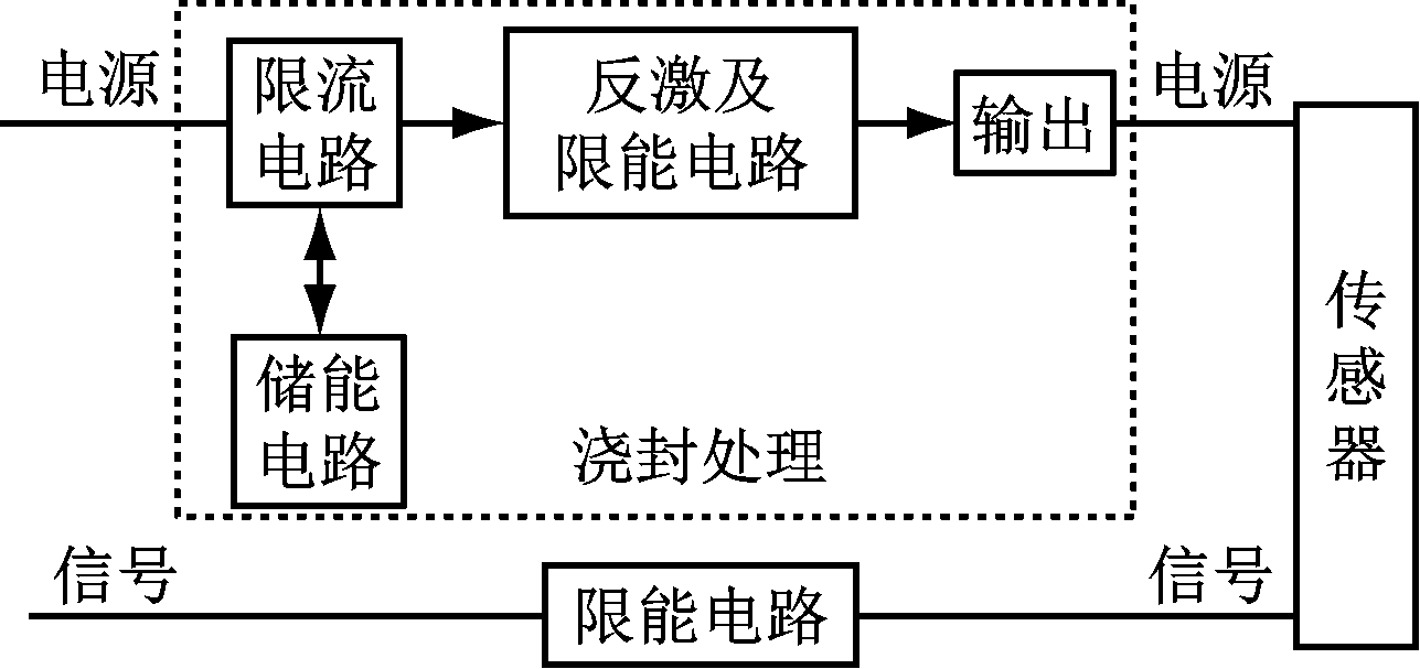 转换接口主要包括电源转换电路和信号转换电路,如图1所示。电源转换电路包括限流电路、储能电路、反激及限能电路3个部分,信号转换电路主要为限能电路。电源转换电路中由于储能电路的存在,容易导致电路启动电流过大,从而引起输入本安电源保护。因此,在转换接口的输入端需增加限流电路。电源转换电路的主拓扑采用反激拓扑结构,可实现升压、降压变换,从而保证输出稳定的直流电压。