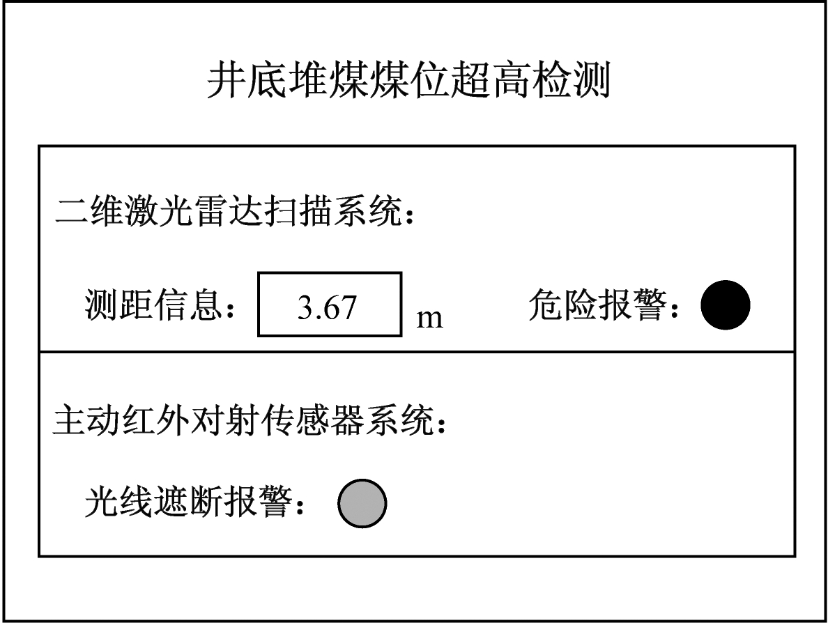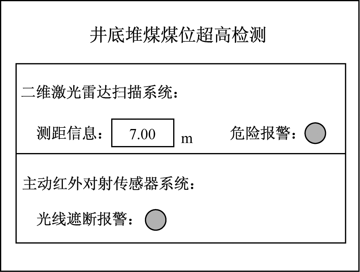 堆煤均未触及2层保护系统时,系统界面如图5(a)所示;当堆煤煤位升高,触及二维激光雷达扫描系统的激光扫描平面时,系统界面如图5(b)所示,测距信息发生变化且开始危险报警;当堆煤得不到及时处理并继续升高,触及主动红外对射传感器系统的光线检测平面时,系统界面如图5(c)所示,光线遮断报警,同时系统控制提升机电控系统使提升机停止运行。测试结果表明,随着堆煤煤位不断增高,系统运行正常、稳定,没有出现误报警、不动作等情况。