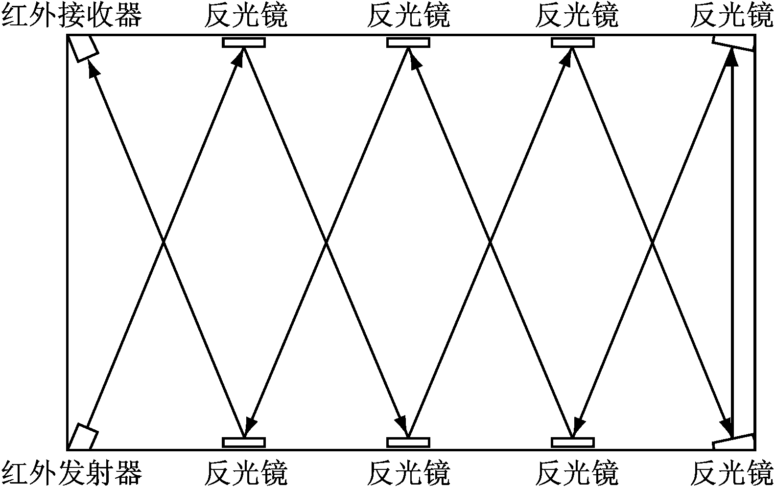 主动红外对射传感器系统主要由1组红外发射器、红外接收器及若干光学反光镜组成[14],如图4所示。通过调整光学反光镜的角度,使红外发射器发出的光线经过若干光学反光镜反射后被红外接收器接收,形成网状结构的光线检测平面,该光线检测平面能够提高系统对堆煤煤位的检测范围。红外发射器和红外接收器采用GUG8F矿用本安型红外传感器发射器和接收器,供电直流电压为12.5 V,电流分别为30,10 mA。当堆煤未触及主动红外对射传感器系统的光线检测平面时,主动红外对射传感器系统输出低电平(≤0.5 V);当堆煤触及主动红外对射传感器系统的光线检测平面时,主动红外对射传感器系统输出由低电平变为高电平(≥10 V)并上传至上位机。上位机控制提升机电控系统使提升机停止工作,防止堆煤煤位过高引起尾绳磨损。