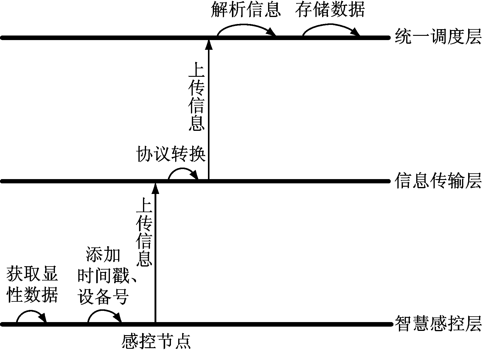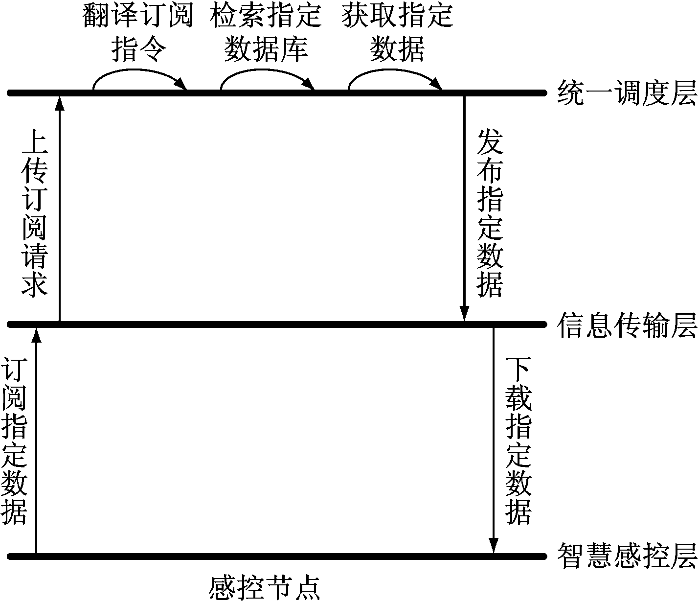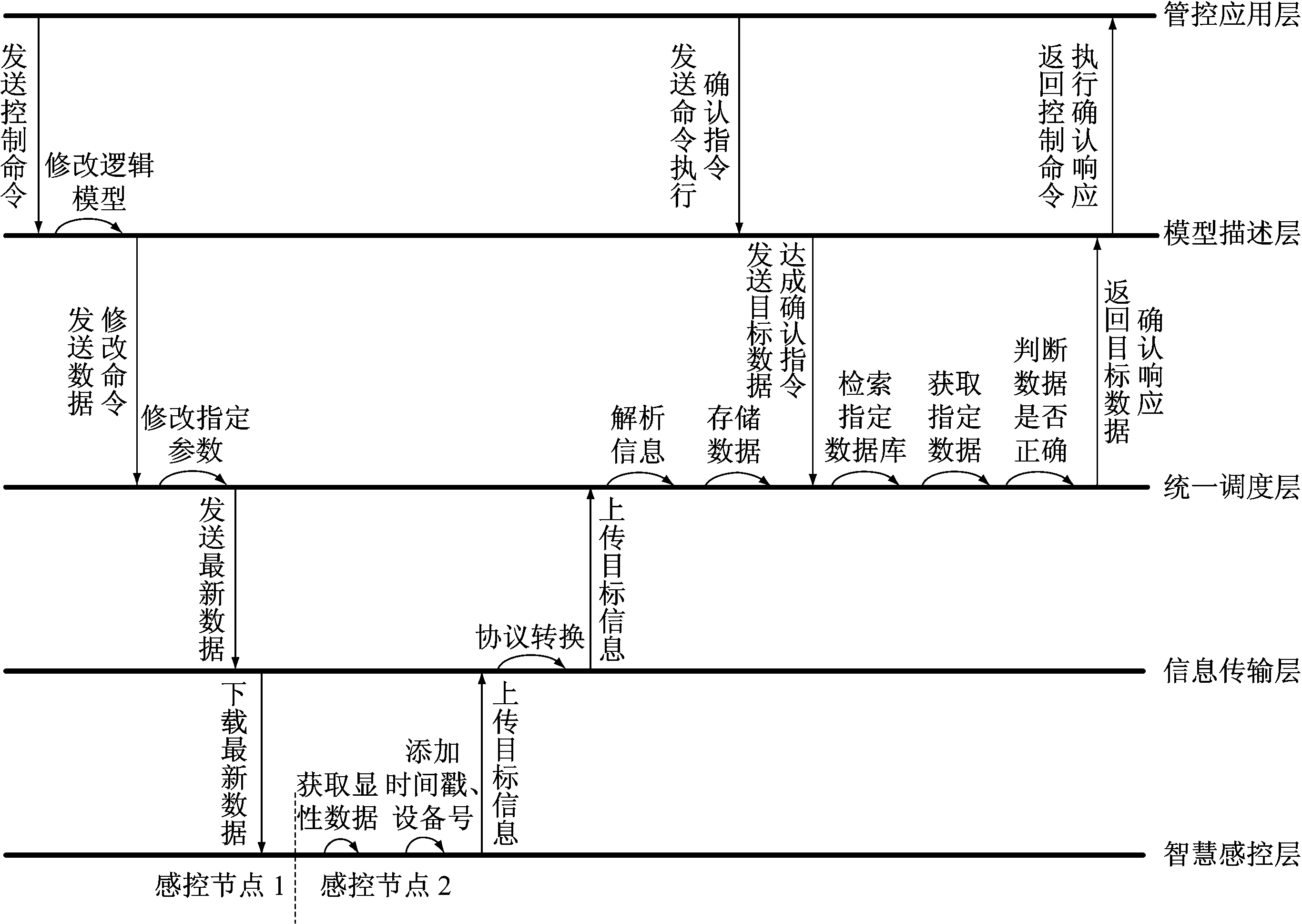 统一调度层工作流程:当统一调度层接收到智慧感控层中感控节点上传的数据时,统一调度层按照数据中的设备号和时间戳将数据存入数据服务器对应的存储单元内,以备操作人员查询,同时向智慧感控层的其他感控节点提供数据共享服务,实现感控节点间的数据互通。当统一调度层接收到智慧感控层中感控节点提交的数据请求信息时,首先根据语义服务器中预先存放的语义信息翻译数据请求信息,然后提取所需数据对应的设备号和时间戳并交给数据搜索器,数据搜索器根据设备号和时间戳在数据服务器中搜索对应的数据,之后协调管理器将数据和对应的设备号、时间戳封装后,根据语义服务器中的语义翻译成对应的信息,并将信息反馈给提交数据请求的相应感控节点。为保证系统全局时间一致,统一调度层会定时将时间信息广播给智慧感控层的各感控节点,同时根据感控节点时间自动校准的要求,向指定感控节点发送时间信息。