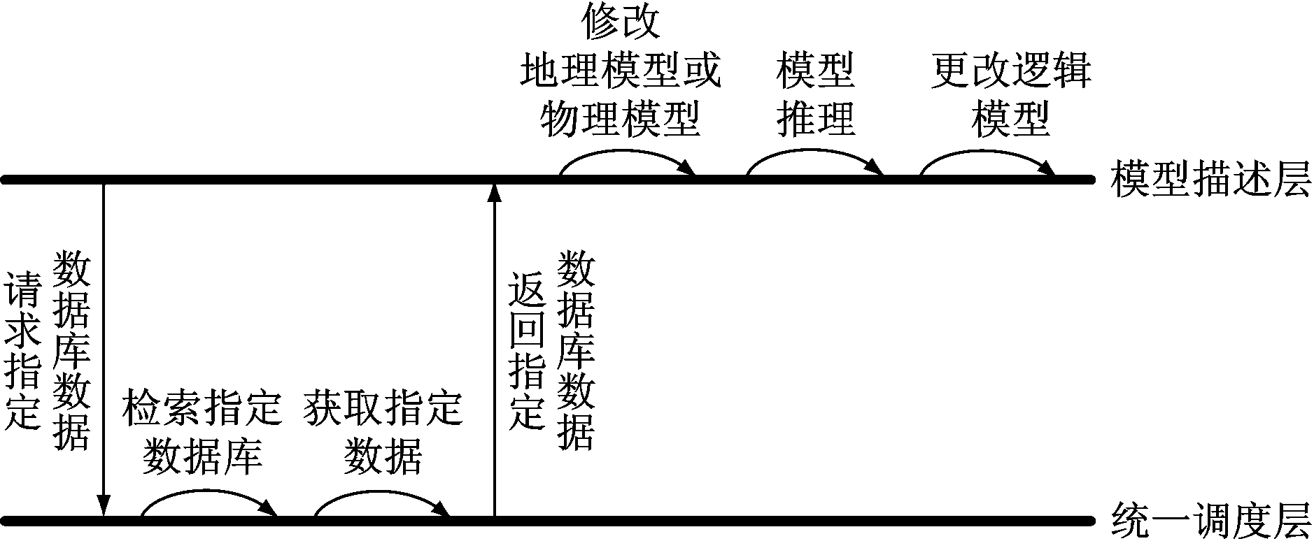 模型描述层修改逻辑模型流程如图6所示。首先模型描述层周期性地向统一调度层发送请求,调取指定数据库的指定数据;然后统一调度层检索数据库后将数据发送回模型描述层;模型描述层获取数据后先修改物理模型或地理模型,再经过模型推理确定新的逻辑模型。