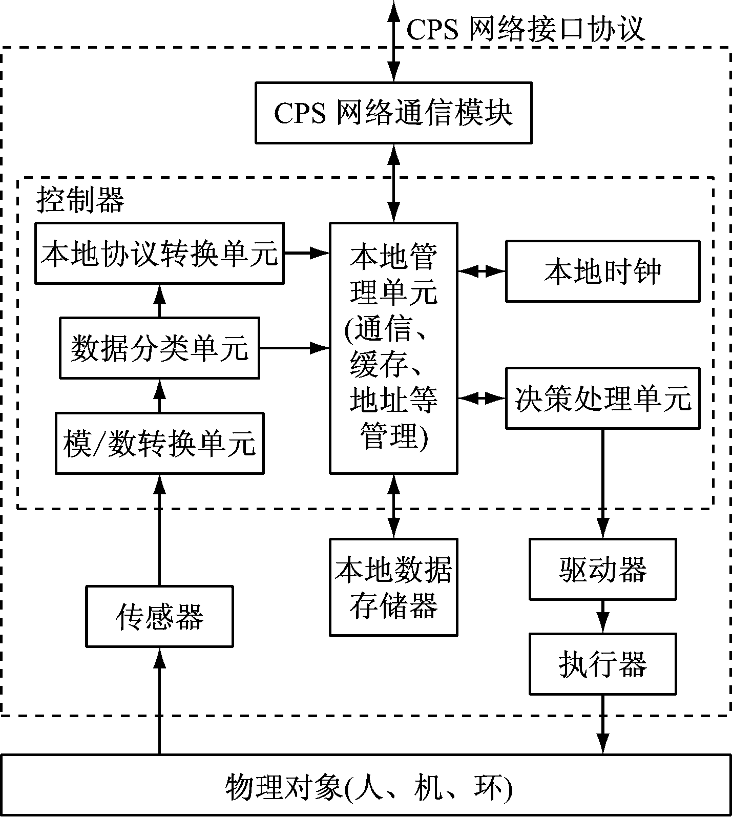 智慧感控层由各种感控节点组成,可实现对矿山中人、机、环的感知、控制、调节。感控节点结构如图2所示。感控节点工作时,传感器采集相应的人、机、环数据并传送至控制器的模/数转换单元,数据经处理后传送至数据分类单元,数据分类单元提取控制器需要的数据并传送至本地管理单元,本地管理单元为数据添加时间戳并分配存储地址,然后将数据存入本地数据存储器。之后,数据分类单元将全部数据传送至本地协议转换单元进行格式处理,再传送至本地管理单元,本地管理单元为数据分配相应的设备号和时间戳,数据经CPS网络通信模块上传至数据服务器,实现数据共享。控制器向数据服务器申请需要的远程数据,同时向本地数据存储器申请本地数据,经过决策处理单元计算后输出控制命令,控制命令经驱动器后由执行器执行。本地时钟通过网络通信自动校准本地时间,使本地时间与系统时间统一。