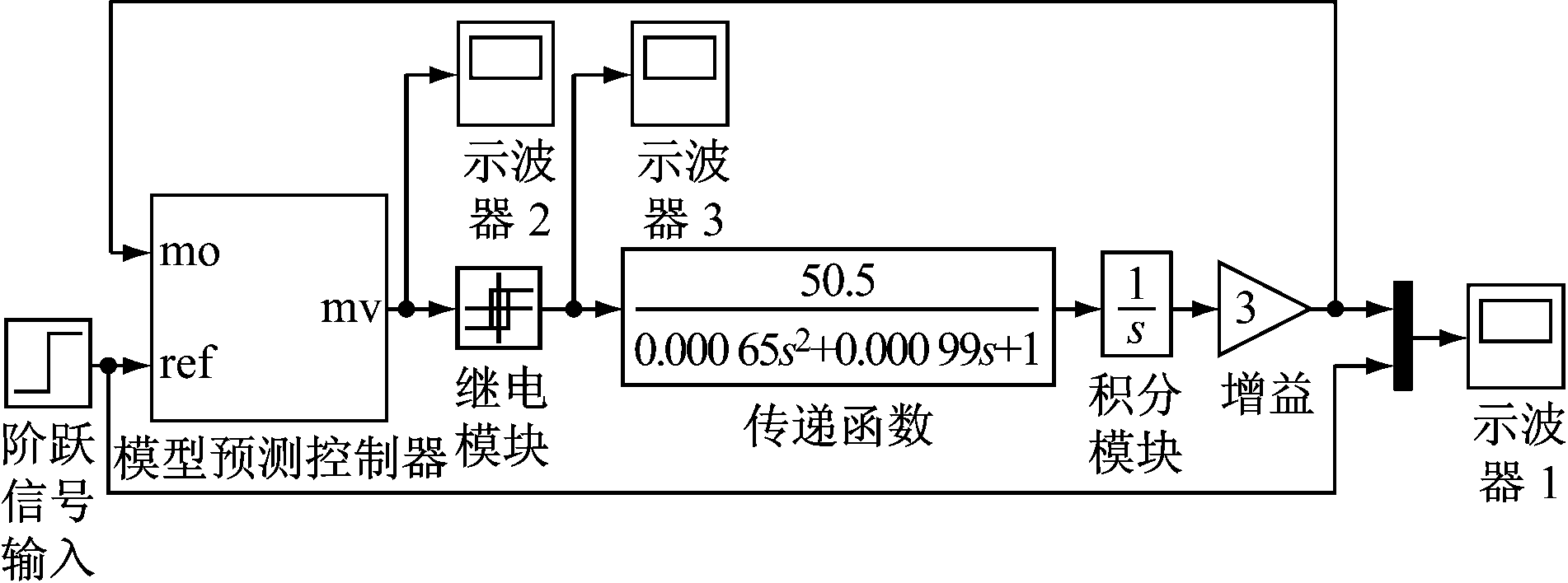 从图5可看出,系统在1 s时产生一个0.020 m的阶跃响应之后,电磁开关阀开闭多次,超调量为4.16×10-3m,经过5 s后仍存在较小的等幅振荡,系统不稳定,电磁开关阀频繁开闭严重影响其使用寿命,超调量较大,无法满足实际工程中的具体要求,因此,在常规模型中加入模型预测控制器进行仿真。在常规模型中加入模型预测控制器,建立采煤机调高系统模型预测控制模型,如图6所示。
