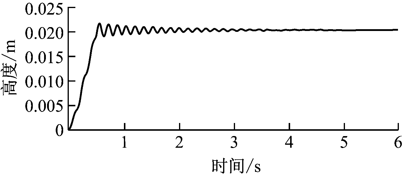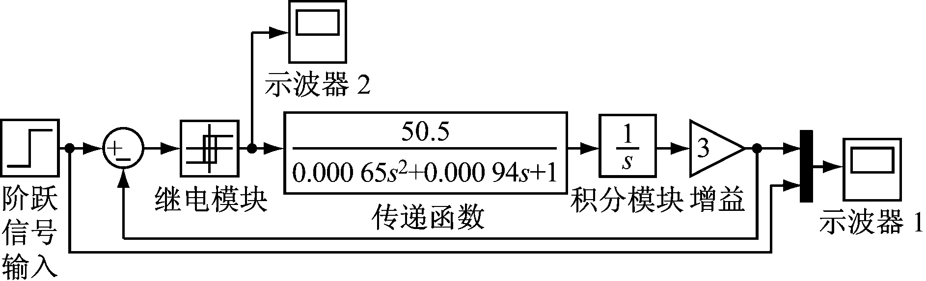在Matlab/Simulink软件中建立系统模型,假设采煤机在一个采样位移(1 m)内,顶板与滚筒之间的误差为0.020 m,将0.020设置为阶跃信号的输入值。MG300/700-WD型交流电牵引采煤机电磁开关阀的流量为2.49×10-3m3/s,为简化系统,将电磁开关阀转换为具有滞环特性的继电模块[12],仿真结果如图5所示。