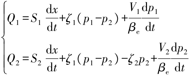 式中:Q1,Q2分别为液压缸无杆腔、有杆腔侧流量;S1,S2分别为液压缸无杆腔、有杆腔作用到活塞的面积;ζ1,ζ2分别为液压缸内泄漏系数、外泄漏系数;p1,p2分别为液压缸无杆腔、有杆腔压力;V1,V2分别为液压缸无杆腔、有杆腔侧体积;βe为液压油体积弹性模量。