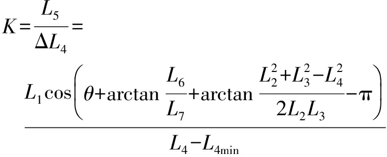 滚筒的调高量与活塞杆位移之间的比例K的计算公式为