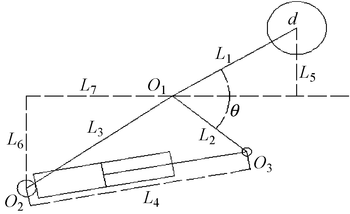 L1-大摇臂长度;L2-小摇臂长度;L3-两铰接点之间的距离;L4-液压缸行程;L5-滚筒竖直方向升高高度;L6-两铰接点之间的竖直距离;L7-两铰接点之间的水平距离;d-滚筒直径