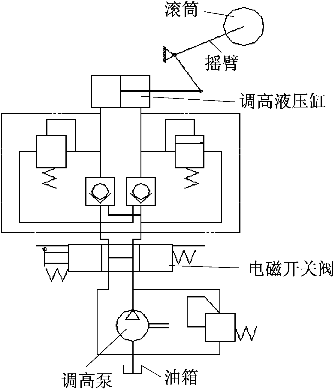 采煤机调高系统通过控制电磁开关阀的通断状态与时间来控制液压缸中活塞杆的伸缩,使摇臂上下摆动,进而带动滚筒实现位置高度的升降,其工作原理如图2所示。