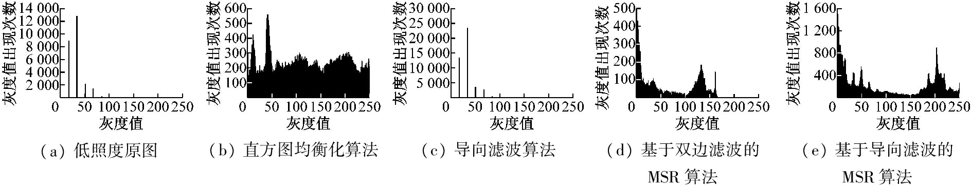 对比可知,低照度下采煤机摇臂图像存在亮度低、对比度差及噪声多的特点。分别利用直方图均衡化、导向滤波、基于双边滤波的MSR算法、基于导向滤波的MSR算法对低照度图像进行增强,并从主观视觉效果和客观评价指数2个方面进行比较。相关参数设置如下:n=3,权重ωi均值为1/3,c=1.2,滤波窗口半径r=10,正则化参数ε=10-5,r,ε为引导滤波调节器滤波效果的重要参数;σs=20,σr=5,σs与σr代表空间相似度及颜色范围相似度的灵敏性。实验结果如图3所示,其中图3(f)—图3(j)分别为图3(a)—图3(e)的ROI提取结果。4种算法处理结果的直方图如图4所示。