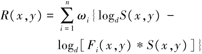 式中:n为尺度数;ωi为尺度权重;Fi(x,y)为中心环绕函数;“*”表示卷积操作;底数d默认为e。