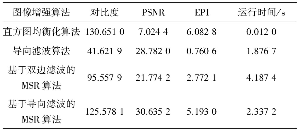 由表1可知,直方图均衡化算法的EPI出现反常,在其PSNR值较小的情况下,EPI异常高,原因是直方图均衡化后的图像噪声较大,用EPI进行评价时,将噪声当作边缘信息保留了下来。直方图均衡化算法的图像增强效果不理想,但在运行时间和对比度上具有明显优势。从PSNR看,导向滤波算法具有较好的保真效果,但边缘保护效果不突出。基于双边滤波的MSR算法EPI较低,说明对细节信息的辨认度低。基于导向滤波的MSR算法在对比度、PNSR和EPI上都表现出较好的优势:EPI较高,说明图像边缘突出,细节信息识别度高;PNSR高,说明保真效果好;另外,运行时间较短,综合效果较好。