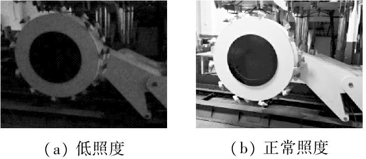 实验设备:Raspberry pi 3,型号为MV-EM200的工业CCD摄像机,三脚架。运行环境:Anaconda3+Python+OpenCV。在实验室条件下,将工业CCD摄像机安装在采煤机对面进行摄像机标定,采集采煤机摇臂图像。分别在2种光照条件下采集2组视频,然后取2组视频序列中采煤机摇臂相同位置的2帧图像,调整像素为640×480。图2分别为正常照度和低照度下采集的2组图像。