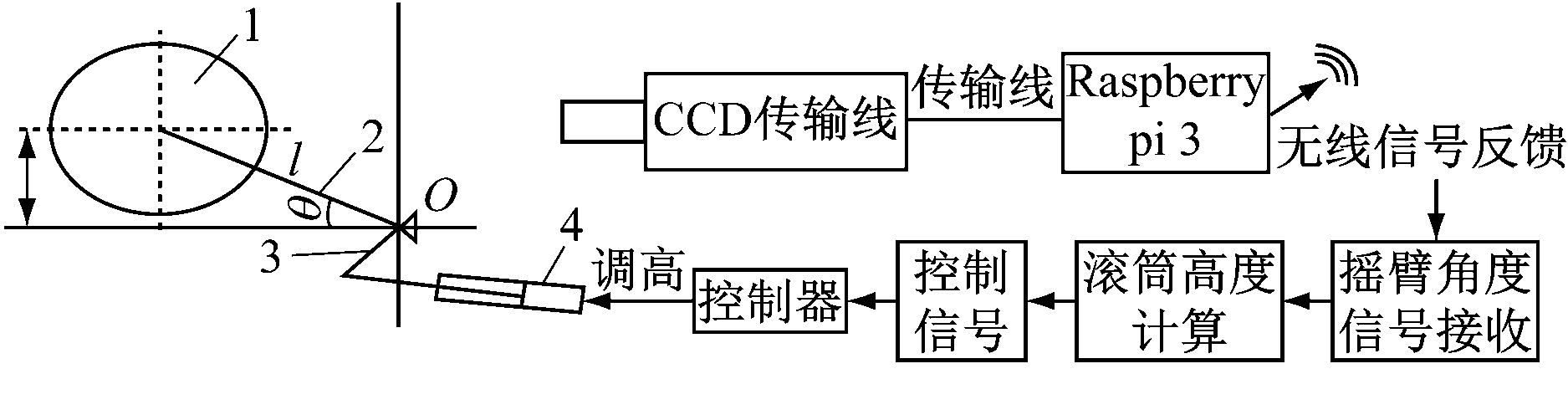 采煤机摇臂角度测量原理如图1所示。使用已标定好的CCD摄像机对采煤机摇臂进行视频采集,将采集的视频帧传入Raspberry pi 3,进行视频帧图像增强处理和角度实时测量;将测量的角度转换为输出信号进行反馈,通过反馈信号计算滚筒调节高度;控制器作用在调高油缸活塞上带动小摇臂,小摇臂带动大摇臂,实现滚筒调高。采煤机滚筒高度H与采煤机摇臂角度θ的关系为