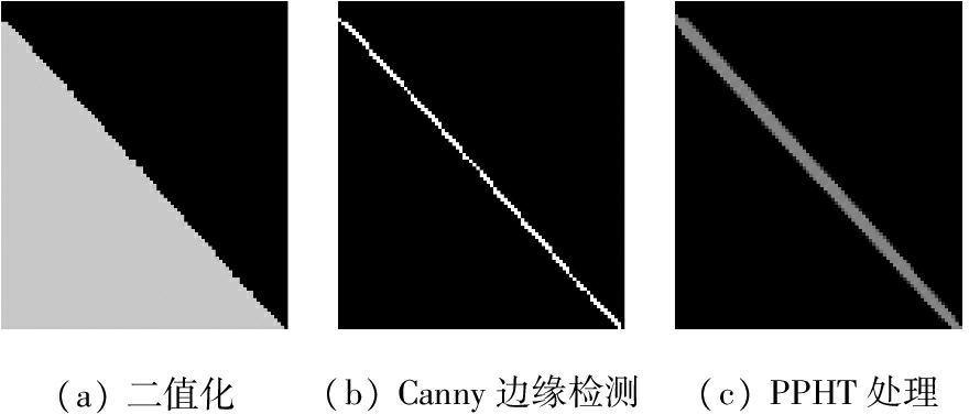 霍夫变换是一种特征提取技术,不受图形旋转的影响[16]。累计概率霍夫变换(Progressive Probabilistic Hough Transform,PPHT)是标准霍夫变换的改进,它在一定范围内进行霍夫变换,计算单个线段的方向及范围,可减少计算量,缩短计算时间。OpenCV中提供的PPHT函数为cv2.HoughLinesP()。本文采用PPHT检测一条直线的多条线向量,计算每条线向量的斜率,再用反正切函数进行角度变换,得出每个线向量的角度,最后对多个角度求平均值,以保证检测角度的准确性。