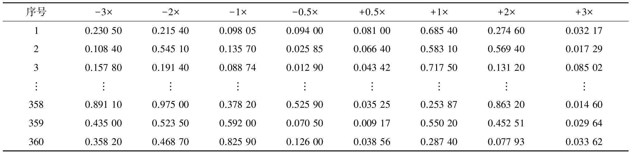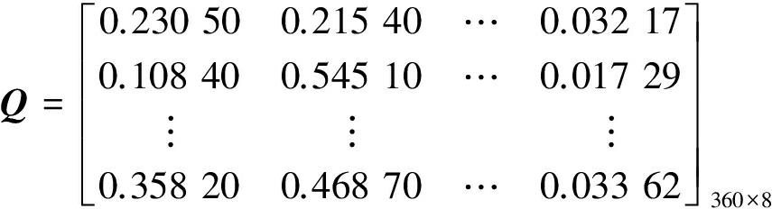 由于在试验过程中存在干扰或其他噪声,所以每组采样数据并不一致。为了提高HMM的泛化能力,从100组故障数据中随机挑选出90组,用其全谱的幅值谱构成HMM输入矩阵,另外10组数据作为验证样本,不参与训练。分别将4种故障振动信号在±0.5×,±1×,±2×,±3×这8个频率处的幅值进行归一化,得到360组数据,见表1。其中1~90号为不平衡故障数据,91~180号为不对中故障数据,181~270号为松动故障数据,271~360号为碰磨故障数据。